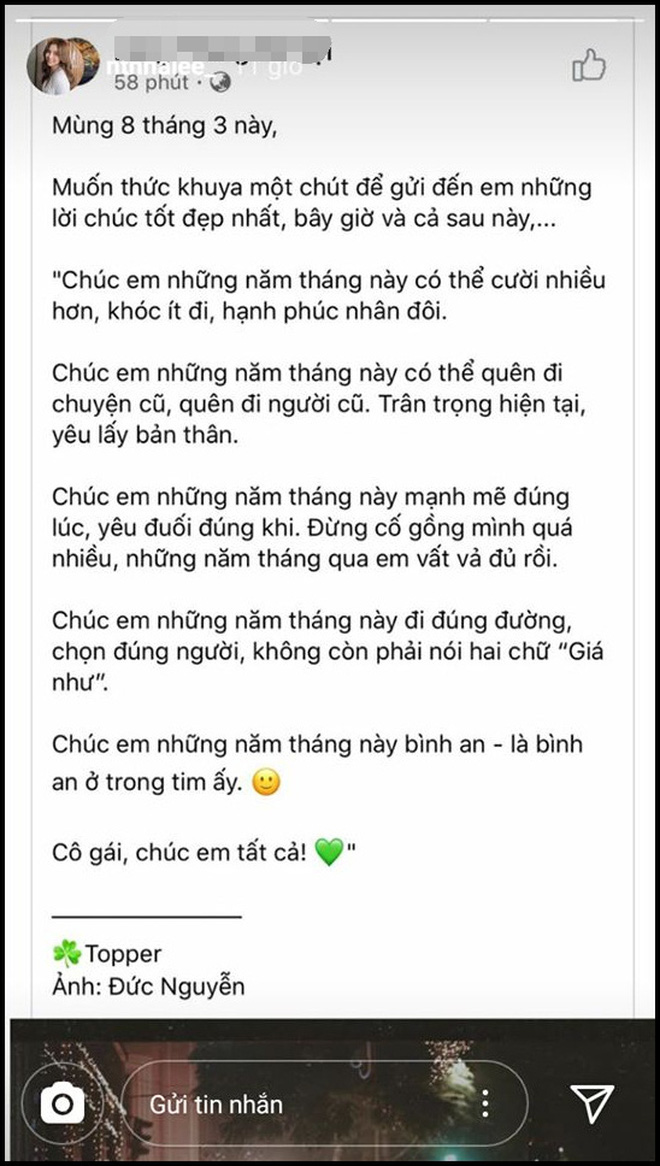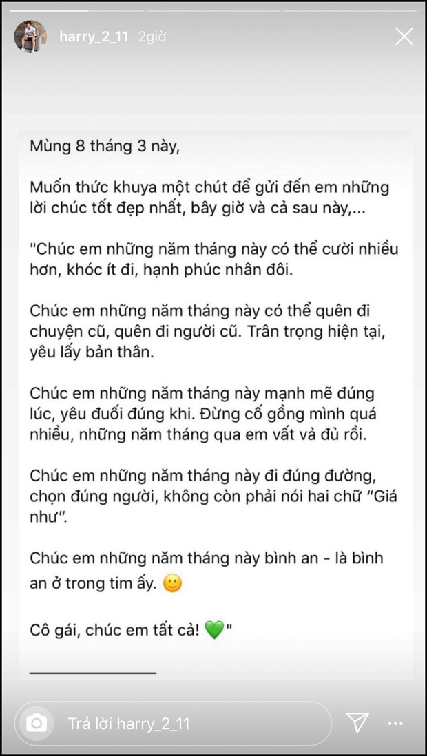 Cụ thể, trên trang cá nhân của mình, Harry Hưng đã up một bài đăng sưu tầm lên trang cá nhân với những lời chúc ý nghĩa và tình cảm, tuy nhiên danh tính cô gái mà chàng thiếu gia muốn dành tặng những lời chúc này lại không được tiết lộ. Tuy vậy dân tình nhanh chóng nhận ra bài đăng này lại đã được Nhật Lê cap màn hình và up ở Instagram thông qua tính năng story từ ngày 7/3.