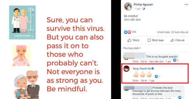 Trên trang cá nhân, anh chàng đã chia sẻ liên tiếp 2 thông điệp bằng cả tiếng Anh và tiếng Việt: “Sure, you can survive this virus. But you can also pass it on to those who probably can’t. Not everyone is a strong as you. Be mindful” (Tạm dịch: Tất nhiên, bạn có thể chống chọi lại con virus này. Nhưng bạn cũng có thể truyền nhiễm nó cho người khác. Những người không chắc sẽ khỏe mạnh được như bạn. Hãy lưu tâm điều này).