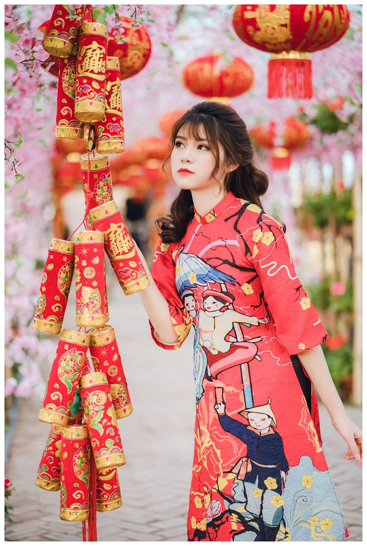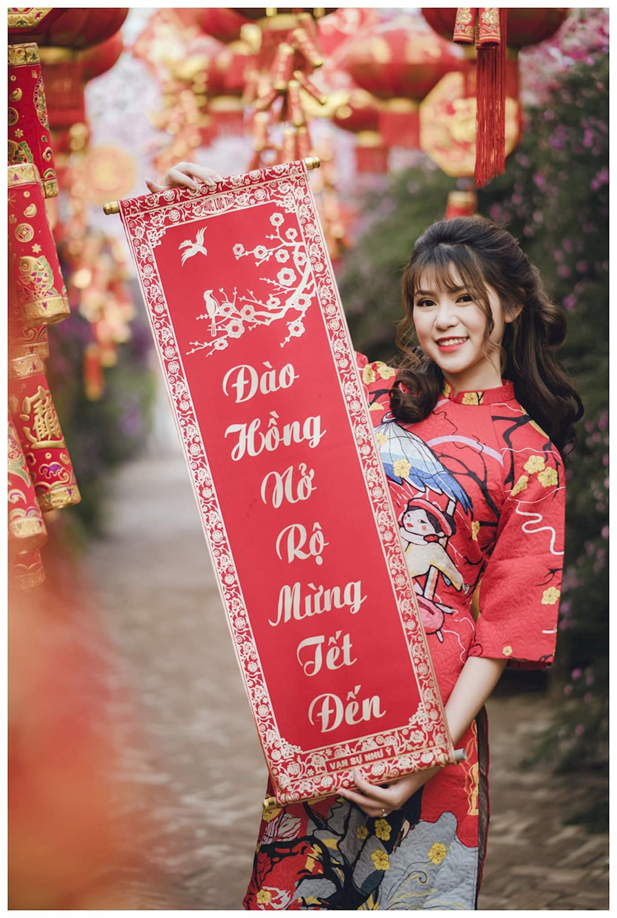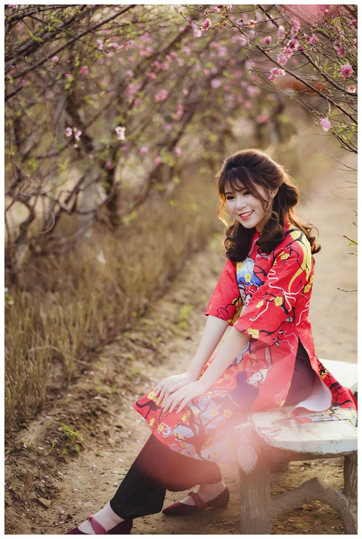Cô nàng diện áo dài cách tân đỏ in họa tiết, nổi bật giữa vườn đào. Cô cho rằng, màu đỏ sẽ đem lại sự may mắn cho một năm mới.