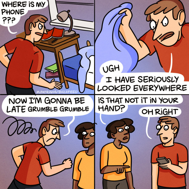 - Điện thoại mình đâu mất rồi nhỉ? Trời ơi đang gấp mà điện thoại không có thì làm thế nào? *bắt đầu cáu* - Thế đang cầm cái gì trên tay kia? - Điện thoại. - Ờ.