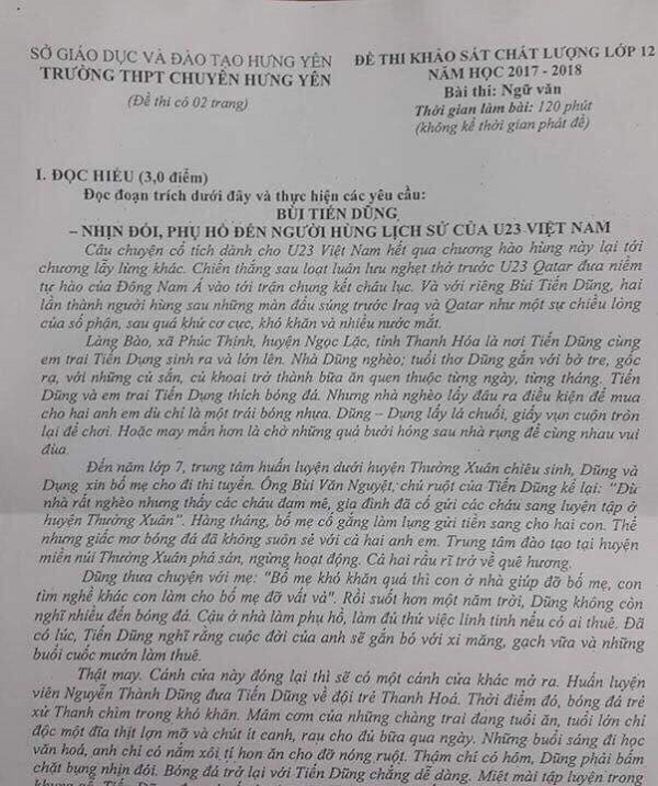 Đề Văn thuộc kì thi khảo sát chất lượng lớp 12 của trường THPT Chuyên Hưng Yên ca ngợi những cố gắng của thủ môn Bùi Tiến Dũng từ “nhịn đói, phụ hồ đến người hùng lịch sử của U23 Việt Nam”.