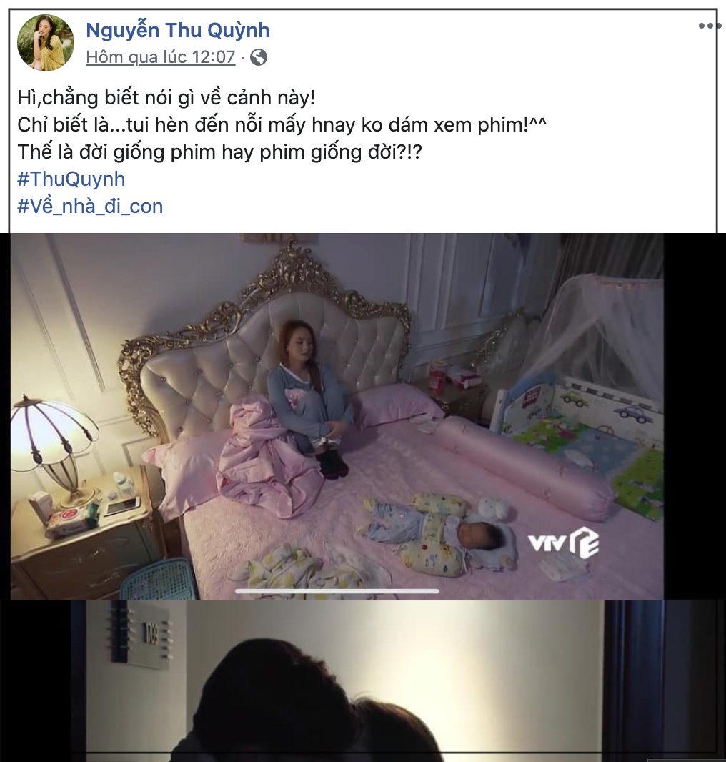 Trong Về Nhà Đi Con, Huệ là một cô gái kém may mắn trong tình yêu và hôn nhân. Ngoài đời, Thu Quỳnh cũng là người như vậy. Và có lẽ vì thế, mà khi nhìn thấy cảnh Thư (Bảo Thanh) ôm con khóc trong lúc chồng qua đêm với nhân tình, cô đã không kiềm được cảm xúc mà thốt lên ”hèn đến nỗi mấy hôm nay không dám xem phim. Thế là đời giống phim hay phim giống đời?”