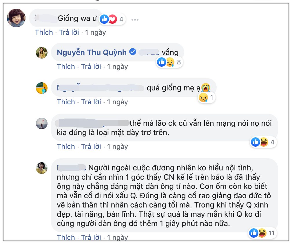 Hiểu được vết thương lòng chưa nguôi ngoai trong lòng người mẹ trẻ, rất nhiều bạn bè, đồng nghiệp và cả fans đã vào bày tỏ sự an ủi cũng như đồng cảm với Thu Quỳnh.
