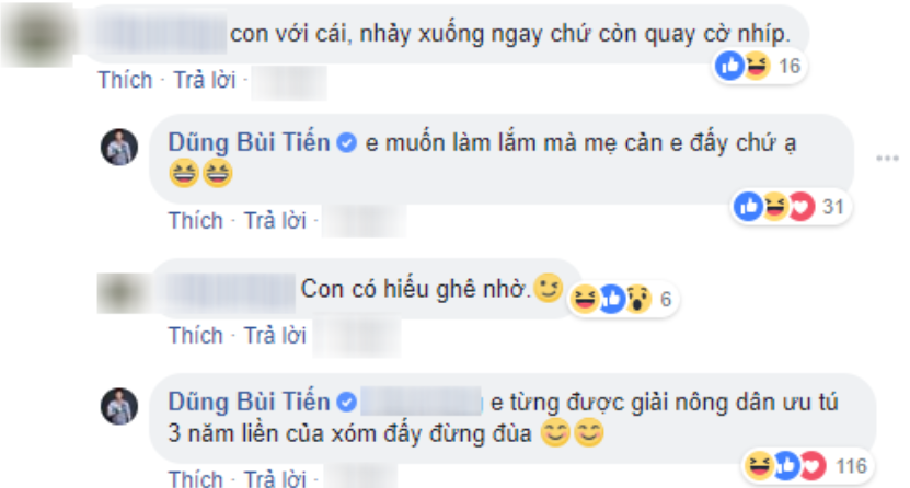Trong phần trả lời bình luận của bạn bè, thủ thành Bùi Tiến Dũng càng làm mọi người thích thú hơn khi chia sẻ rằng mình làm đồng còn giỏi hơn đá bóng. Anh cũng hài hước khoe ngày trước anh từng nhận giải “nông dân ưu tú” của… xóm suốt 3 năm liền.