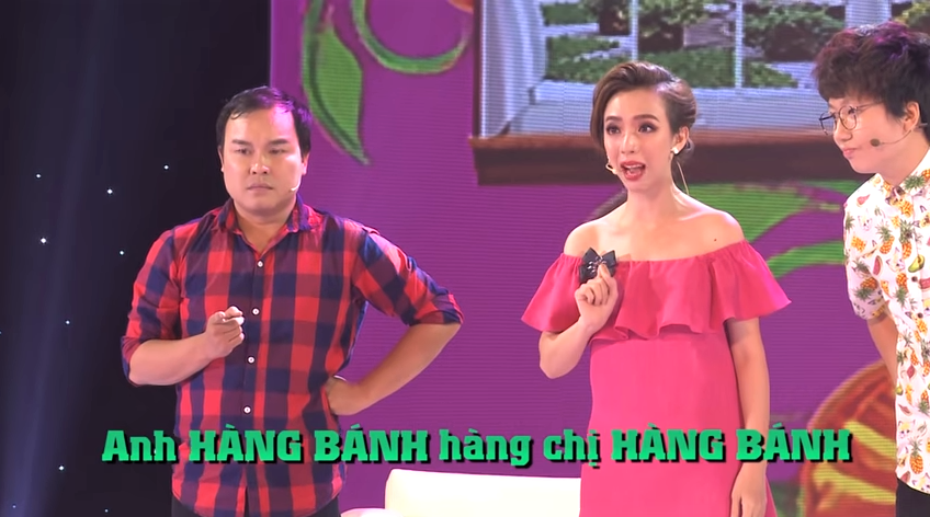 Thu Trang liên tục đưa ra những câu đối hài hước, duyên dáng để thể hiện kiến thức thơ văn uyên bác nhưng không kém phần bựa khiến khán giả nhiều phiên cười ngặt nghẽo như câu chuyện hai anh chị hàng bánh hoặc..