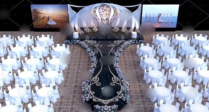 Theo những hình ảnh xuất hiện trên mạng xã hội, đám cưới này được trang trí lộng lẫy với 2 tông màu chủ đạo là tím và trắng. Phần sân khấu của đám cưới cầu kỳ với tạo hình như vỏ sò, bàn ghế ăn tiệc được lựa chọn tỉ mỉ và sang trọng.