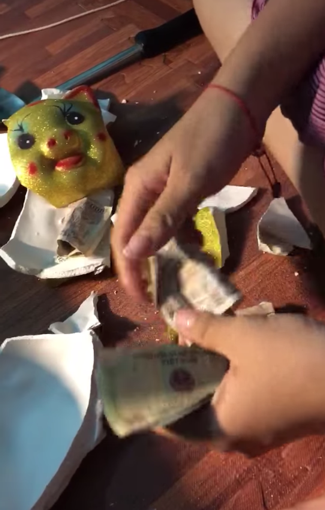 Kèm theo bài viết là clip cô nàng đập heo đất. Cô lôi từ trong bụng heo ra một vài tờ tiền lẻ cùng polymer, tổng cộng được 97k - chưa bằng tiền mua heo đất.