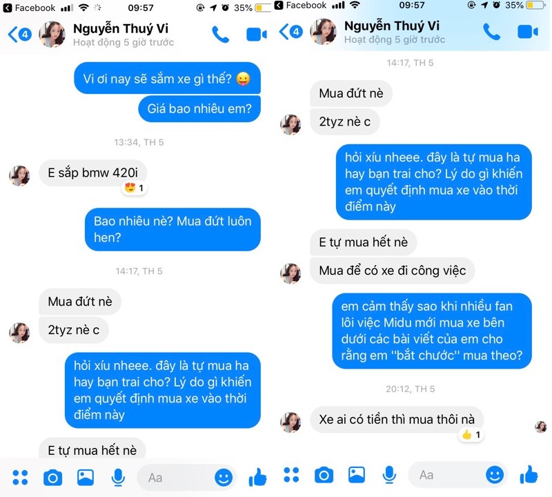 Riêng việc nhiều fan cho rằng Thúy Vy “bắc chước” Midu mua xe, cô nàng tự tin trả lời “Xe ai có tiền thì mua thôi”.