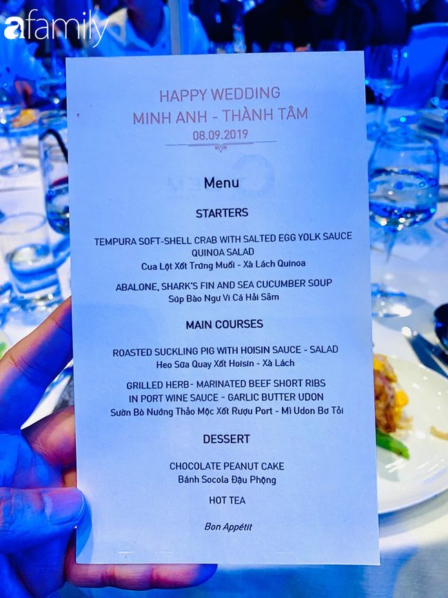 Thực đơn tiệc cưới toàn món ăn “sang chảnh” như: Cua lột xốt trứng muối - salad hạt quinoa, súp bào ngư vi cá hải sâm, heo sữa quay xốt hoisin, sườn bò nướng thảo mộc sốt rượu Port (Bồ Đào mỹ tửu), mì Udon bơ tỏi và bánh chocolate đậu phộng. (Ảnh: Afamily)