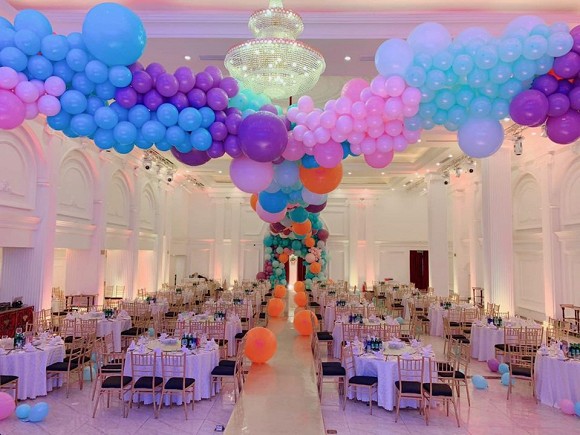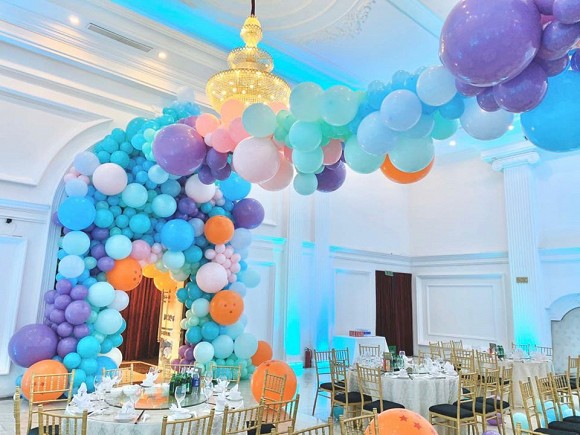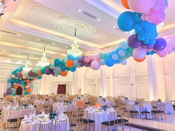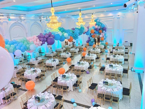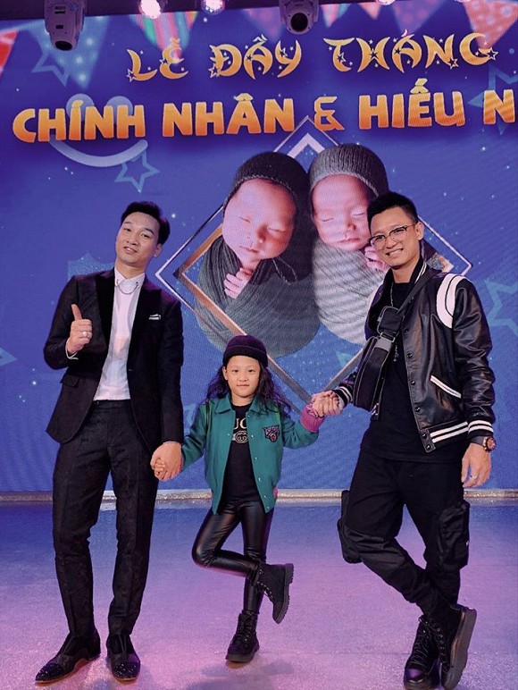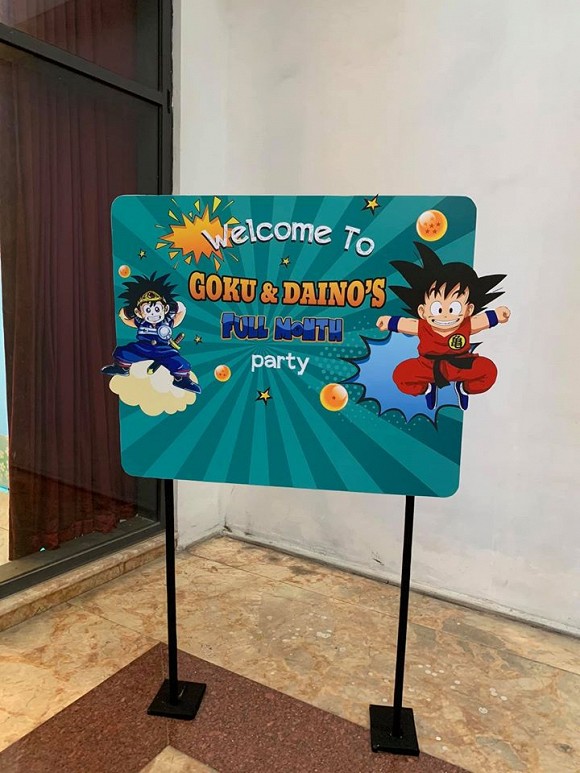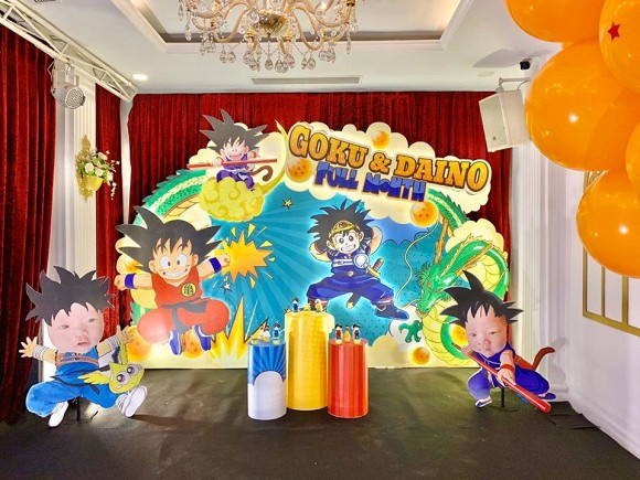 Không gian nhà hàng được trang trí bằng những quả bóng bay đủ màu sắc cùng hình ảnh của hai cậu con trai Chính Nhân và Hiếu Nhân. Bên cạnh đó, những nhân vật trong truyện 7 Viên Ngọc Rồng cũng khiến không gian trở nên thú vị hơn. Được biết, nam MC đặt tên thân mật cho hai con trai dựa trên hai nhân vật của bộ truyện này, Goku và Daino.