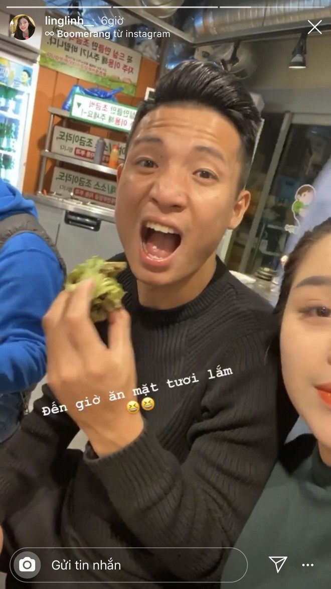 Ẩm thực là điều không thể thiếu trong mỗi chuyến du lịch, Tiến Dũng đã đưa Khánh Linh đi thưởng thức nhiều món ăn ngon tại Hàn Quốc và bà xã của anh cũng không quên check-in và khoe ngay trên story instagram: “Đến giờ ăn mặt tươi lắm”. Khoảnh khắc hài hước, đáng yêu của đôi vợ chồng nhận được nhiều phản hồi tích cực từ cộng đồng mạng.