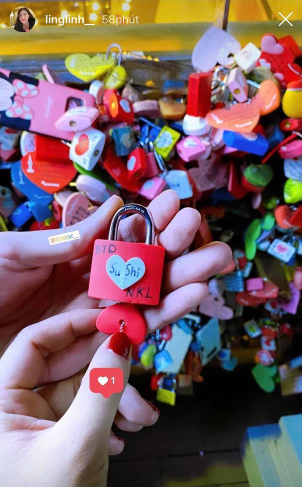 Tuy trốn con đi chơi riêng nhưng cặp đôi cũng không quên thể hiện tình yêu với Sushi bằng cách viết tên con gái lên chiếc khóa tình yêu gửi lại ở Tháp Namsan - nơi mà bất kỳ cặp tình nhân nào cũng muốn ghé thăm khi đặt chân tới Hàn Quốc và tại hai đầu của chiếc khóa còn viết thêm kí tự viết tắt tên Bùi Tiến Dũng và Nguyễn Khánh Linh thể hiện tình cảm thắm thiết của gia đình nhà trung vệ người Hà Tĩnh.