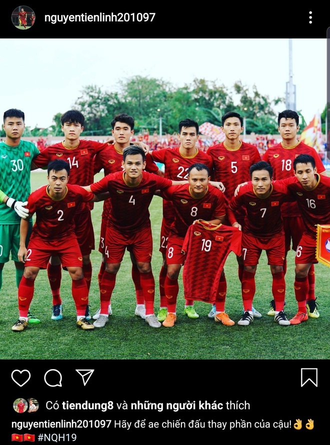 Như muốn đáp lời Quang Hải, Tiến Linh một lần nữa bày tỏ tình cảm và sự tri ân gửi đến người đồng đội của mình. Trên trang cá nhân, chàng tiền đạo gốc Hải Dương đã đăng tải dòng trạng thái: “Hãy để anh em chiến đấu thay phần của cậu”, kèm bức ảnh các cầu thủ U22 Việt Nam chụp ảnh cùng chiếc áo số 19.