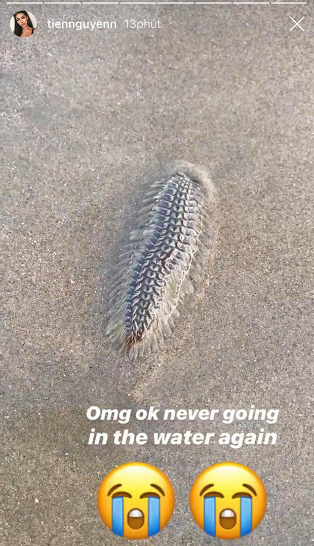 Trong bài đăng trên story Instagram cá nhân, Tiên Nguyễn hoảng hốt khẳng định rằng: “Không bao giờ xuống nước nữa” sau khi nhìn thấy một chú sâu với vẻ ngoài đáng sợ đang cố chui rúc để ẩn mình trong cát.