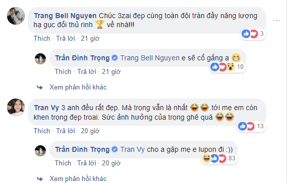 Anh Trọng của em hôm qua làm tốt cực kỳ, nhưng bệnh “gắt” thì vẫn chưa hết à, có phải do anh Mạnh xúi nữa không Trọng??”, bạn nữ có tài khoản facebook Lê Hoàng Trọng Thủy hài hước bình luận.