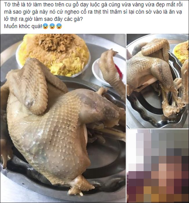 “Tớ thề là tớ làm theo Google dạy luộc gà cúng vừa vàng vừa đẹp mắt rồi mà sao giờ gà này nó cứ nghẹo cổ ra, thịt thì thâm sì lại còn ăn vạ sờ vào là lở thịt ra, giờ làm sao đây. Muốn khóc quá”, chia sẻ của cô gái khiến các chị em vừa thương vừa buồn cười.