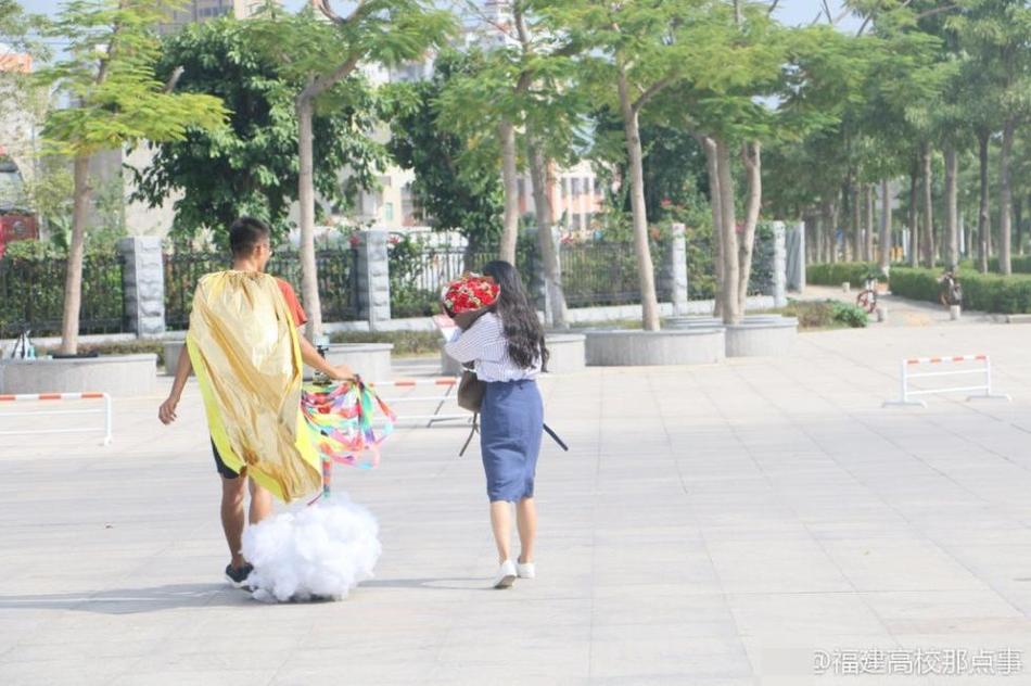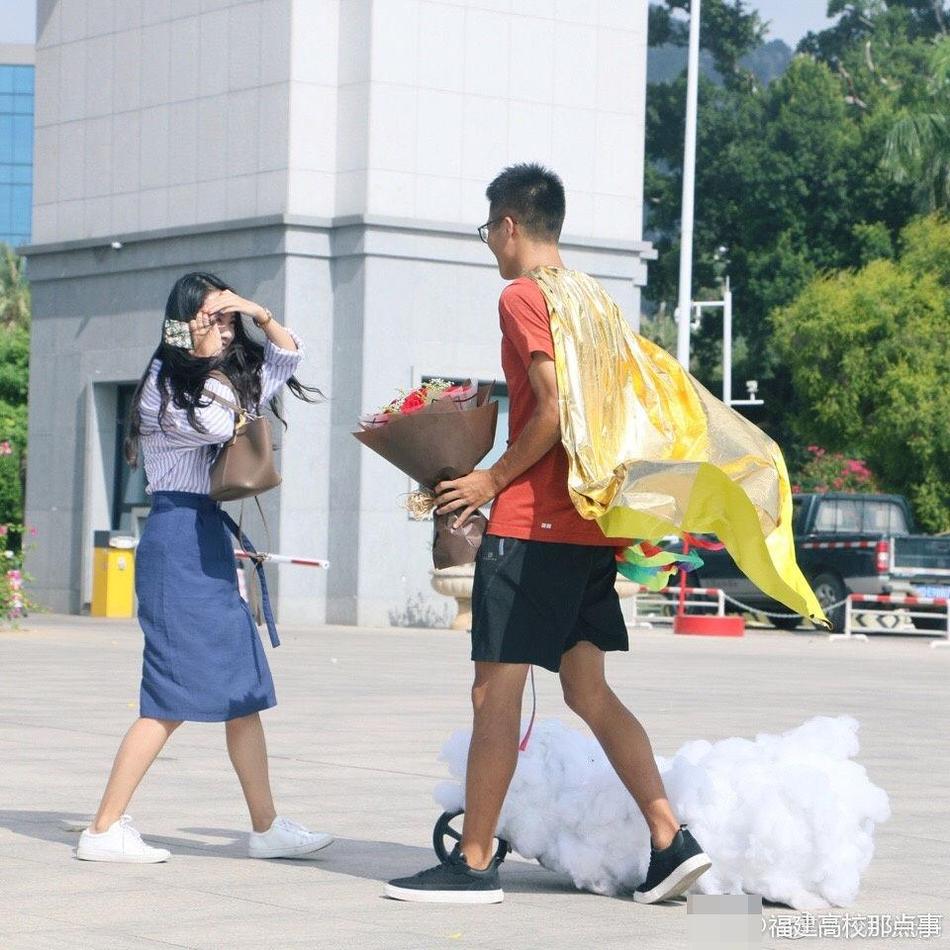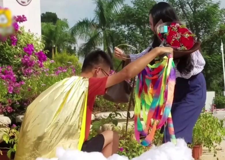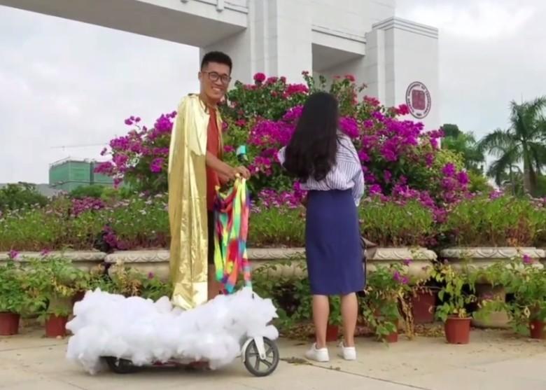 Lúc này, anh chàng chưa vội vàng tỏ tình đâu, mà lại chỉnh trang y phục, lôi ra đạo cụ mà mình chuẩn bị sẵn. Đó là… một đám mây giả, một áo choàng cùng những dải ruy băng đầy sắc màu. Concept tỏ tình của anh là: ”Cưỡi gió đạp mây để đến gặp tiên nữ”, vì trong lòng anh, cô gái xinh đẹp không thua gì tiên nữ trên trời.