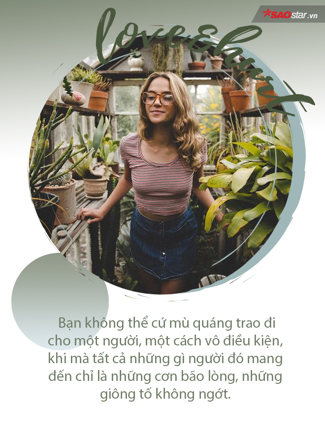 Chúng ta chọn đặt thật nhiều yêu thương vào một người, cũng là chọn đặt chia sẻ một nửa những giây phút, những hơi thở trong phần đời đó cho người đó, không phải để yêu cầu được nhận lại nguyên vẹn những gì đã cho đi, nhưng hẳn nhiên là để được cảm thấy những nỗi dịu dàng nảy nở trong tim. Bạn không thể cứ mù quáng trao đi cho một người, một cách vô điều kiện, khi mà tất cả những gì người đó mang đến chỉ là những cơn bão lòng, những giông tố không ngớt.
