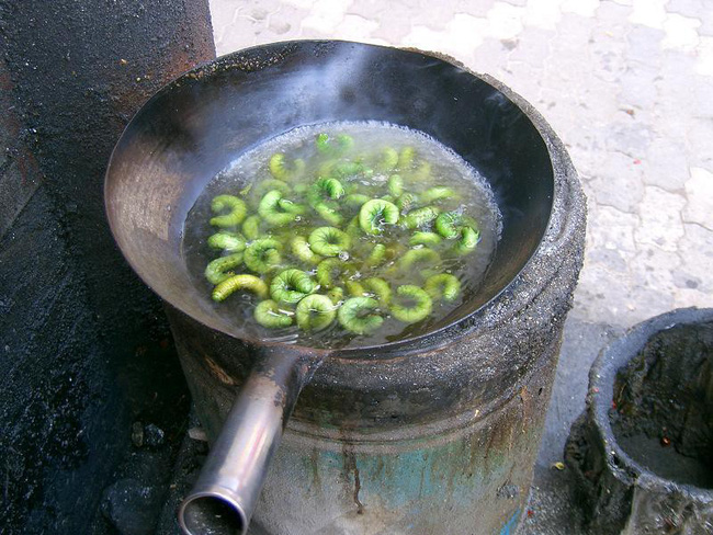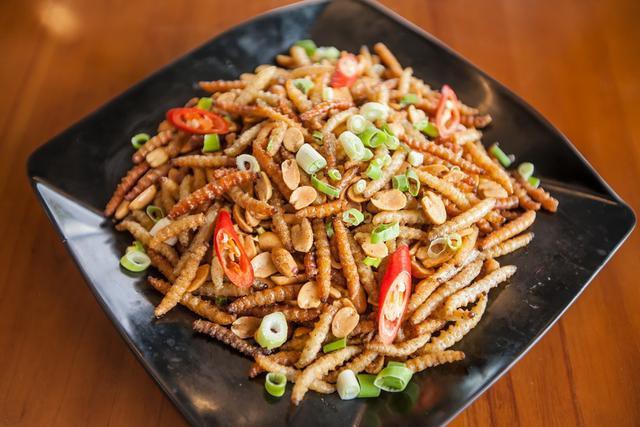 Có lẽ không có món ăn nào gây khiếp đảm bằng món “sâu nấu bảy món” của người Giang Tô. Đầu bếp sẽ chế biến chúng bằng cách lột vỏ hoặc để nguyên con rồi xào với trứng, nấu súp, rán giòn hay thậm chí là nấu canh. Loại nguyên liệu này được xem như là một món ăn bổ dưỡng, giàu protein và thơm ngon. Khỏi nói thì ai cũng biết cảnh người nước ngoài trợn mắt bỏ chạy ngay khi vừa nhìn thấy nồi sâu lúc nhúc. Không hổ danh người châu Á luôn tận dụng hết mức các nguyên liệu trong thiên nhiên để làm phong phú ẩm thực (tuy có phần hơi ghê rợn).
