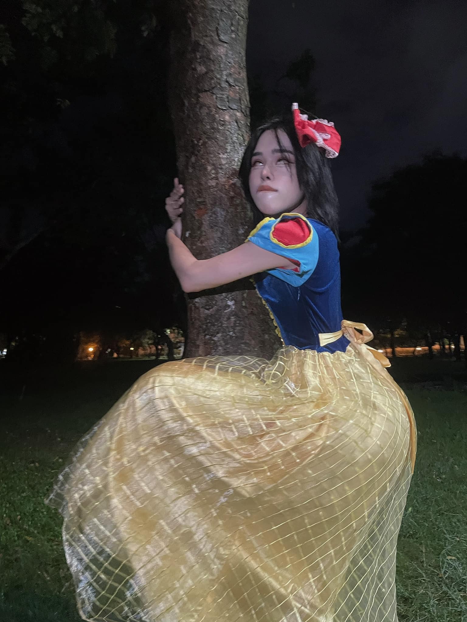 Dù mặc váy nhưng Trần Đức Bo vẫn vô tư trồng nhào lộn, leo cây hay tạo dáng kì dị bên trái táo. "Nàng Bạch Tuyết Mu nằm trầu trực chờ chú lùn Quang Tèo trở về… nhưng không may bị mụ phù thuỷ độc ác cho ăn quả táo độc. Ai méc Tèo giúp Bo với huhu", Trần Đức Bo chú thích.