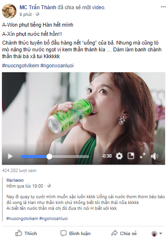 Thậm chí, Hari còn lỡ miệng nói vài câu cảm thán tiếng Hàn hàm ý vô lon nước uống vô cùng tuyệt vời nhanh như đọc rap trước sự ngỡ ngàng của trợ lý. Trấn Thành khi nghe được chỉ còn biết đầu hàng.