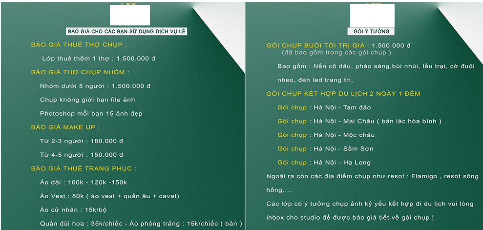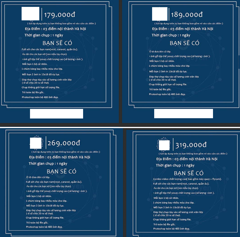 Với các gói giá rẻ, thì nam sẽ có áo vest, nữ sẽ có áo dài, khuôn viên chụp thường là sân trường, công viên, bãi cỏ… concept không có gì quá sáng tạo và số lượng thợ thường chia đều cho 20 người/ 1 thợ. Với các gói giá cao, thì học sinh có thể được chụp ở hơn 3 địa điểm khác nhau, trang phục đa dạng, được cung cấp đạo cụ hỗ trợ, flycam, nến, pháo hoa… Thậm chí còn có cả xe đưa đón với số ngày chụp có thể kéo dài hơn 2 ngày.