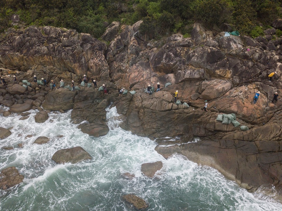 Những túi rác được chuyển bằng tay dọc sườn núi đá