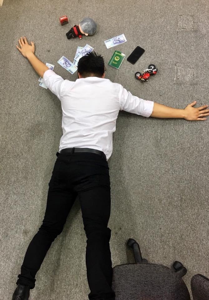 Đồng đội ngã sấp mặt, ví rơi ra đống tiền, xe, hộ chiếu… còn cậu bạn này ngã sấp mặt, cái xắc xinh xinh chỉ rơi ra toàn sách thôi. Ảnh: Quyên Quyên.