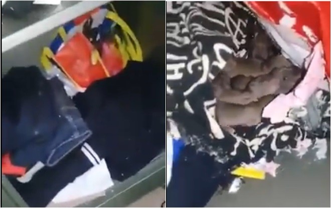 Sau vài giây tìm kiếm, cuối cùng cả 2 đều tá hỏa khi nhìn thấy 1 chiếc túi đựng quần áo đã trở thành ổ cho chuột cái sinh con. Chú chuột cái lớn đang nằm cùng bầy con lúc nhúc. Con chuột mẹ còn giương mắt nhìn người lạ, không hề tỏ ra sợ hãi.