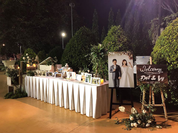 Bữa tiệc lần này cũng được diễn ra ở ngoài trời. Không gian tiệc cưới lung linh trong ánh đèn bên cạnh khu vườn ngập tràn cây xanh và rất nhiều hoa.