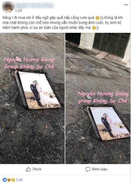 Tài khoản N.H.N viết: “Sáng mình đi mua xôi ở đầu ngõ gặp quả nắp cống cute quá! Đúng là khi nhà chật không còn chỗ treo nhưng vẫn muốn trưng ảnh cưới, hi sinh kỷ niệm hạnh phúc vì sự an toàn của người khác đây mà!”.