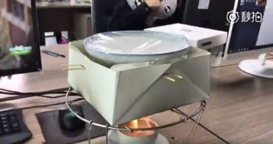 Chiếc bếp đun nấu đủ mọi thứ được làm bằng vòng thép và một hộp giấy đựng bánh ngọt.