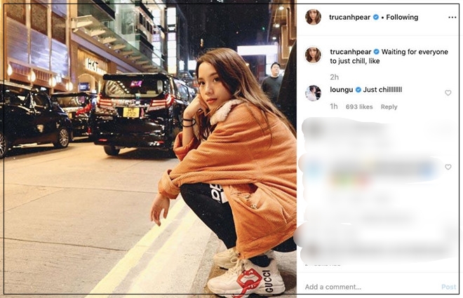 Mới đây, cô đã đăng tải hình ảnh mới lên Instagram kèm caption: ”Waiting for everyone to just chill, like” (Tạm dịch: Đợi mọi người tới để thư giãn là như thế này). Bài viết nhanh chóng nhận về hơn 20 nghìn lượt thích. Trong số đó, bình luận của Trang Lou (em gái Huyme) được dân tình khá chú ý.