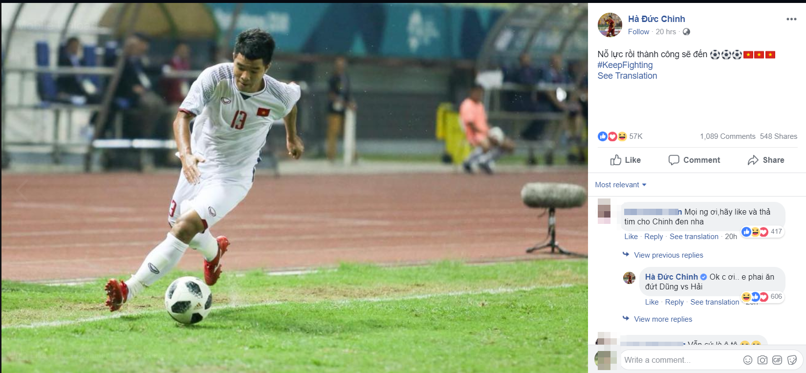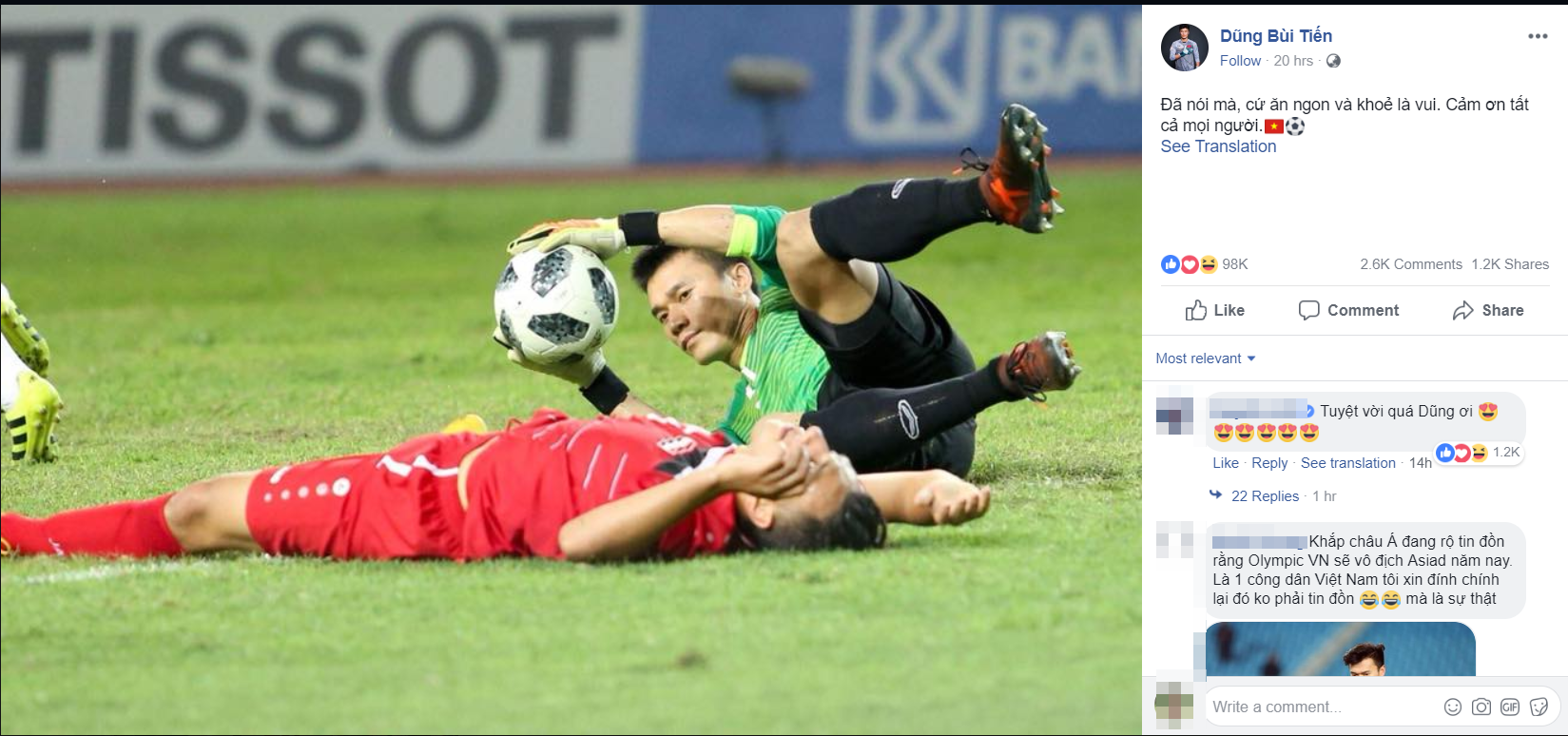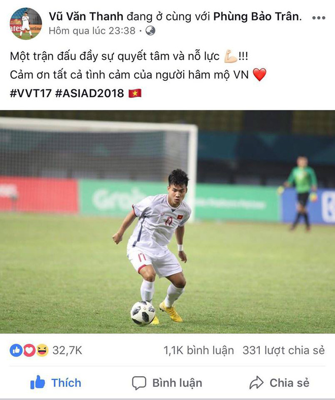 Anh chàng đăng tải bức ảnh cùng đoạn status khá ngắn. Tuy nhiên dòng status đó đã bị chỉnh sửa đến 9 lần trước khi chốt lại bằng câu: “Một trận đấu đầy sự quyết tâm và nỗ lực!!! Cảm ơn tất cả tình cảm của người hâm mộ VN. #VVT17 #ASIAD2018”.