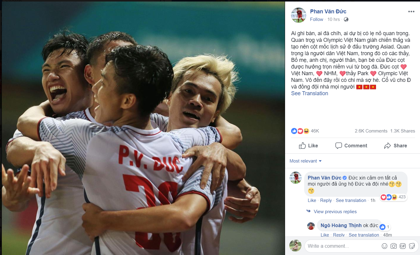 “Ai ghi bàn, ai đá chính, ai dự bị có lẽ không quan trọng. Quan trọng là Olympic Việt Nam giành chiến thắng và tạo nên cột mốc lịch sử ở đấu trường ASIAD. Quan trọng là người dân Việt Nam, trong đó có các thầy, bố mẹ, anh chị, người thân, bạn bè của Đức được hưởng trọn niềm vui từ bóng đá. Vô đến đây rồi có chi mà sợ hè. Cổ vũ cho Đức và đồng đội nhé mọi người'.