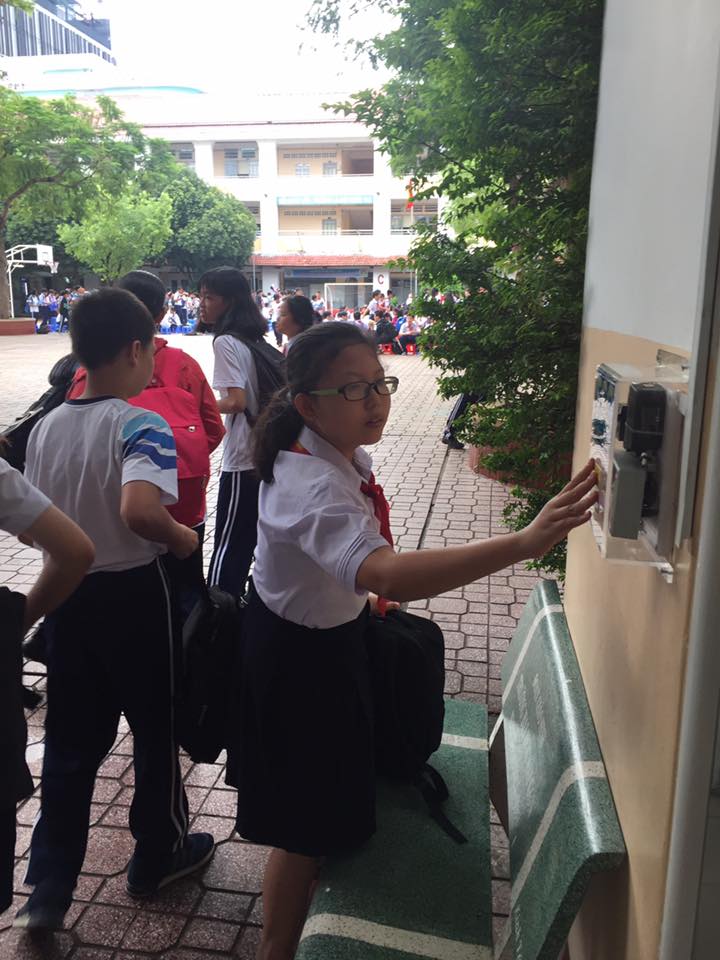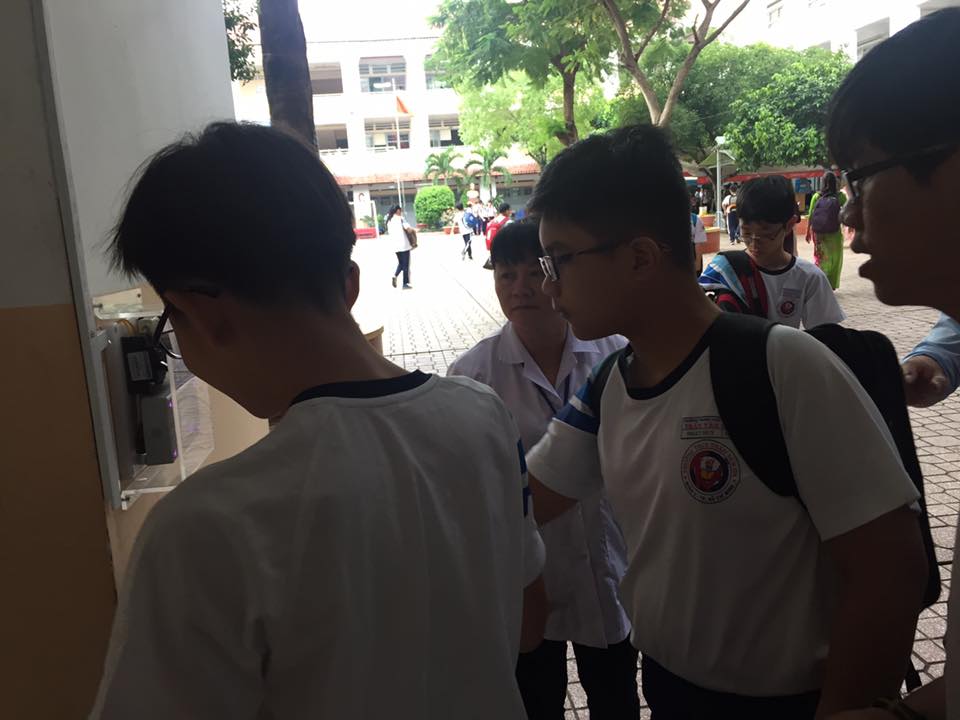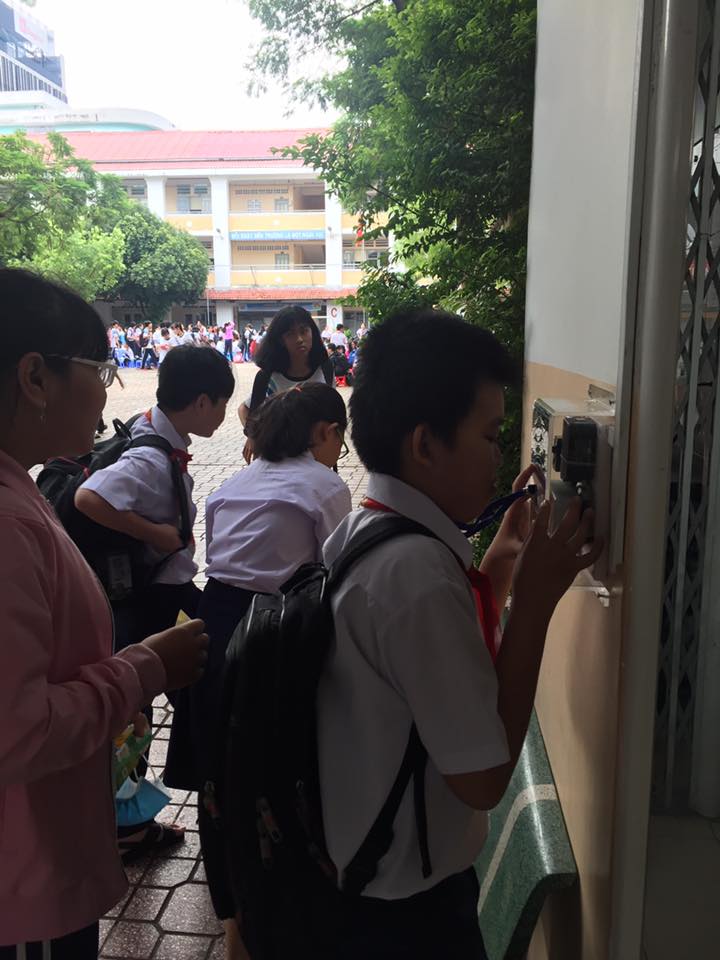 Máy chấm điểm danh được bố trí ngay cổng ra vào sân trường.