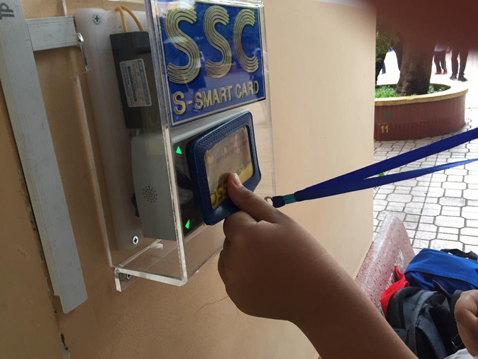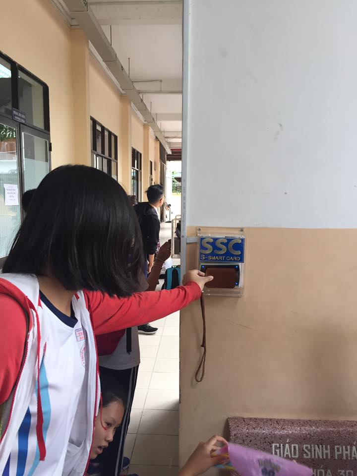 Học sinh được các cô cho thử nghiệm quẹt thẻ. Được biết, thẻ sẽ được cấp qua GVCN, ai ai cũng có.