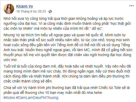 Vy chia sẻ trên trang cá nhân của mình: “Tuổi trẻ là tuổi của lòng đam mê, đầy hoài bão và nhiệt huyết. Vậy nên nếu đã mang trong mình đam mê rực cháy, thì đừng ngần ngại, hãy cứ theo đuổi một cách đúng đắn và nhiệt thành nhất. Khi chúng ta dám làm điều phi thường thì chắc chắn thành công sẽ đến.”