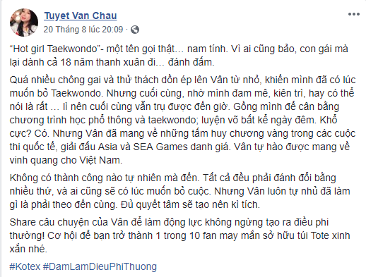 “Quá nhiều chông gai và thử thách dồn ép lên Vân từ nhỏ, khiến mình đã có lúc muốn bỏ Taekwondo. Nhưng cuối cùng, nhờ mình đam mê, kiên trì, hay có thể nói là rất … lì nên cuối cùng vẫn trụ được đến giờ. Gồng mình để cân bằng chương trình học phổ thông và taekwondo; luyện võ bất kể ngày đêm. Khổ cực? Có. Nhưng Vân đã mang về những tấm huy chương vàng trong các cuộc thi quốc tế, giải đấu Asia và SEA Games danh giá. Vân tự hào được mang về vinh quang cho Việt Nam.