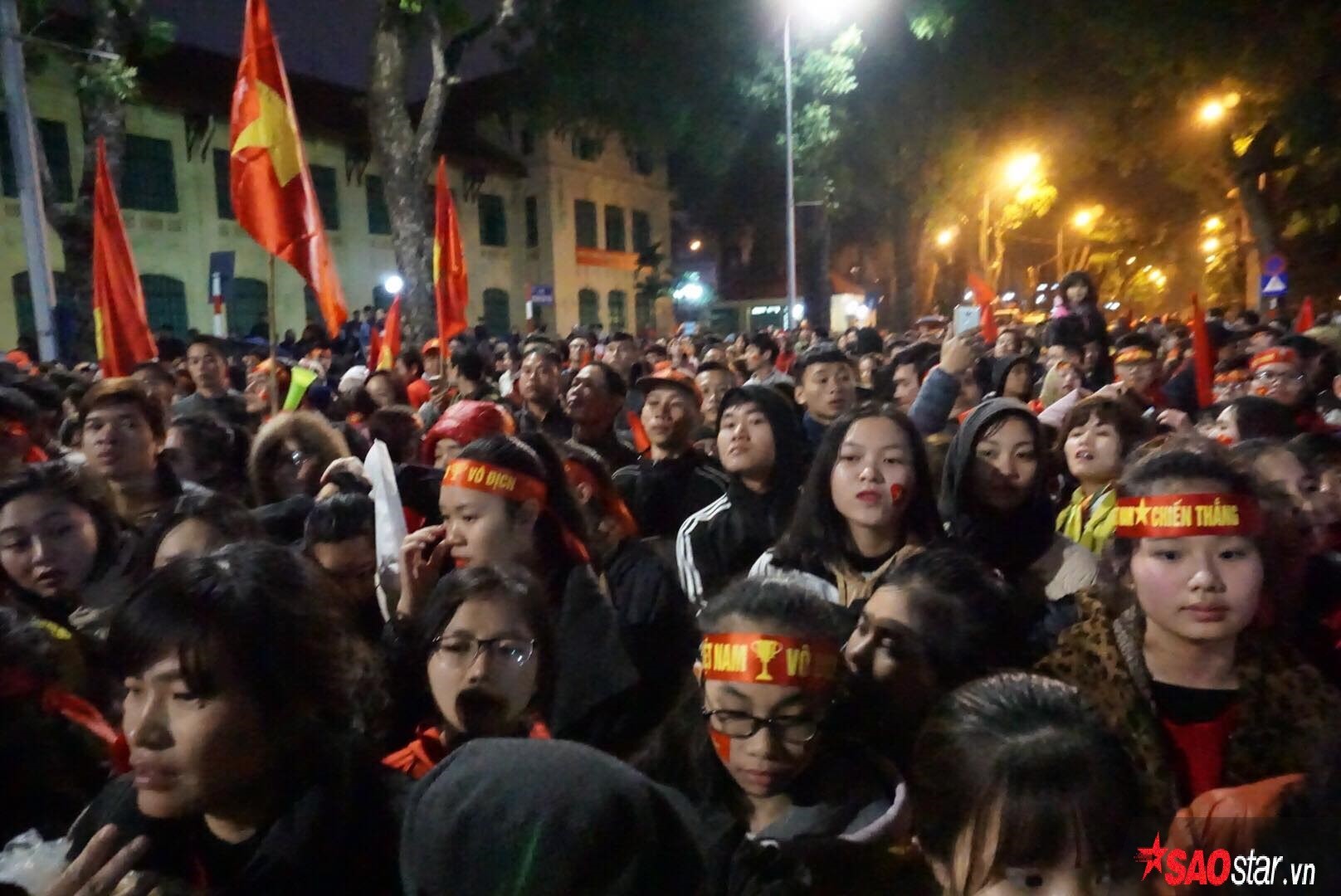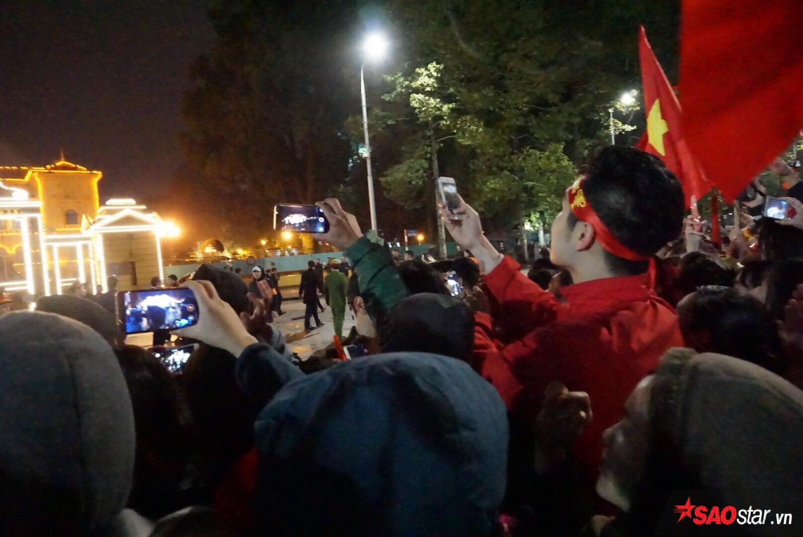 Đến thời điểm này, khi trời đã tối mịt nhưng vẫn rất đông các cổ động viên mang theo cờ tổ quốc, liên tục reo hò, chúc mừng trước khu vực Lăng Hồ Chủ Tịch - nơi các cầu thủ đang làm lễ dâng hương. Không khí hết sức sôi động.