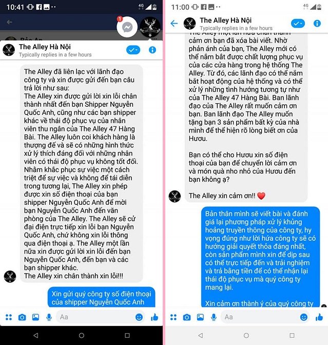 Ngay sau thời điểm bài đăng, phía đại diện công ty nhận trách nhiệm hoàn toàn về mình, và yêu cầu được xin lỗi đến toàn thể các bạn đã và đang sử dụng dịch vụ của The Alley, bên phía The Alley đã có động thái xin lỗi và đưa ra phương án giải quyết xin số điện thoại và mời trực tiếp shipper Nguyễn Q A lên văn phòng đại diện để gửi đến bạn và các bạn shipper khác lời xin lỗi.