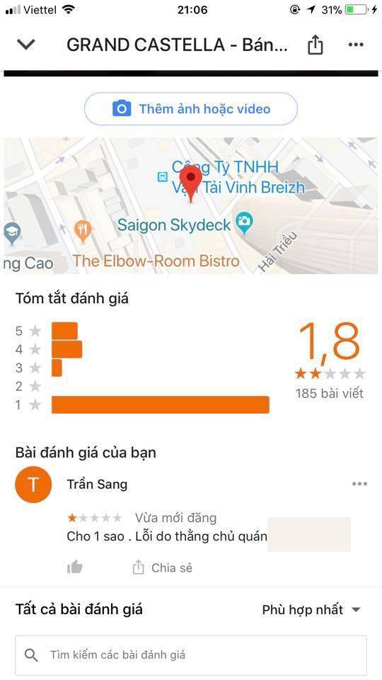 Cửa hàng bánh ngọt nổi tiếng Grand Castella của ca sĩ Dương Triệu Vũ bị đánh giá 1 sao