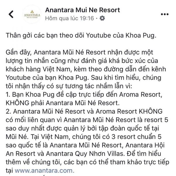 Một khách sạn tên khác Anantara cùng ở Mũi Né cũng bị vạ lây đến mức phải lên tiếng đính chính.