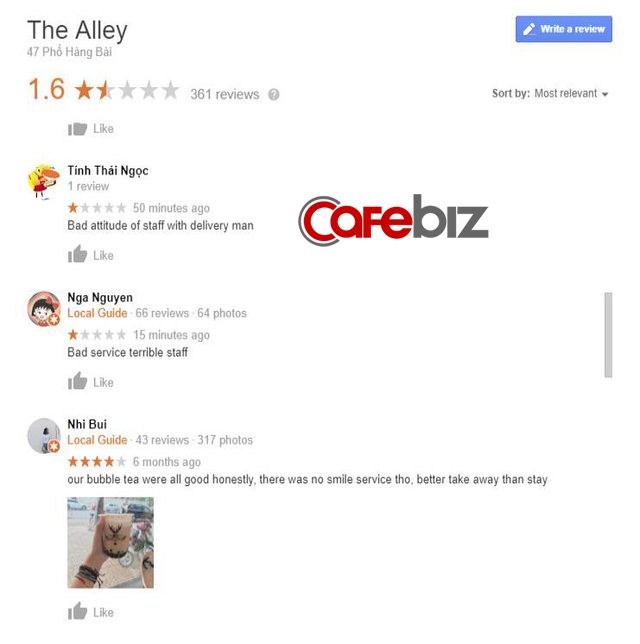 Chưa rõ độ xác thực của thông tin trên nhưng The Alley đã nhận “mưa” review 1 sao từ cộng đồng mạng. Trên Google review, đánh giá của The Alley Hàng Bài tụt xuống chỉ còn 1,6 với đa phần các nhận xét đều tiêu cực. Thậm chí nhiều review còn viết bằng tiếng Anh để chỉ trích thái độ của nhân viên The Alley.