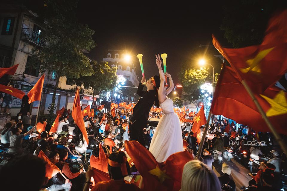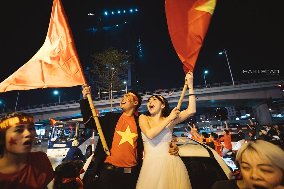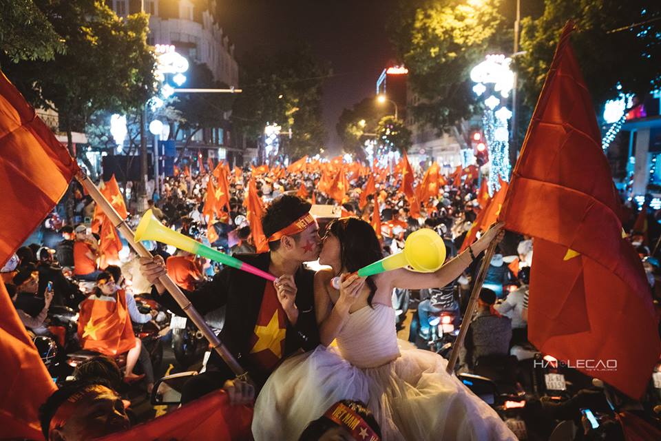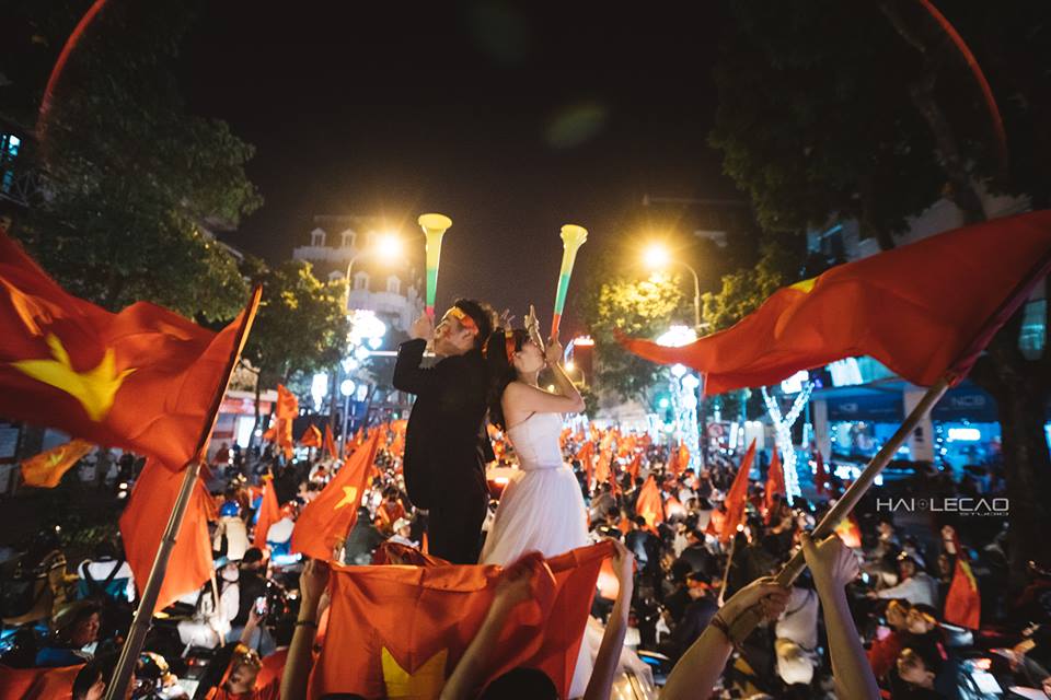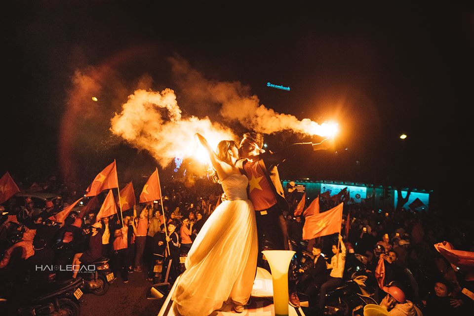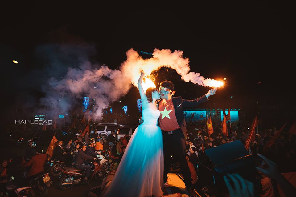Được biết, trước đó, nhiếp ảnh gia Hải Lê Cao đã đăng tải trên Facebook một dòng trạng thái: ”Việt Nam! Thắng trận này xuống đường chụp ảnh cưới ngay trong đêm nay!”. Và sau đó, khi U23 Việt Nam thắng, anh đã giữ đúng lời hứa ”Việt Nam nói là làm của mình”.
