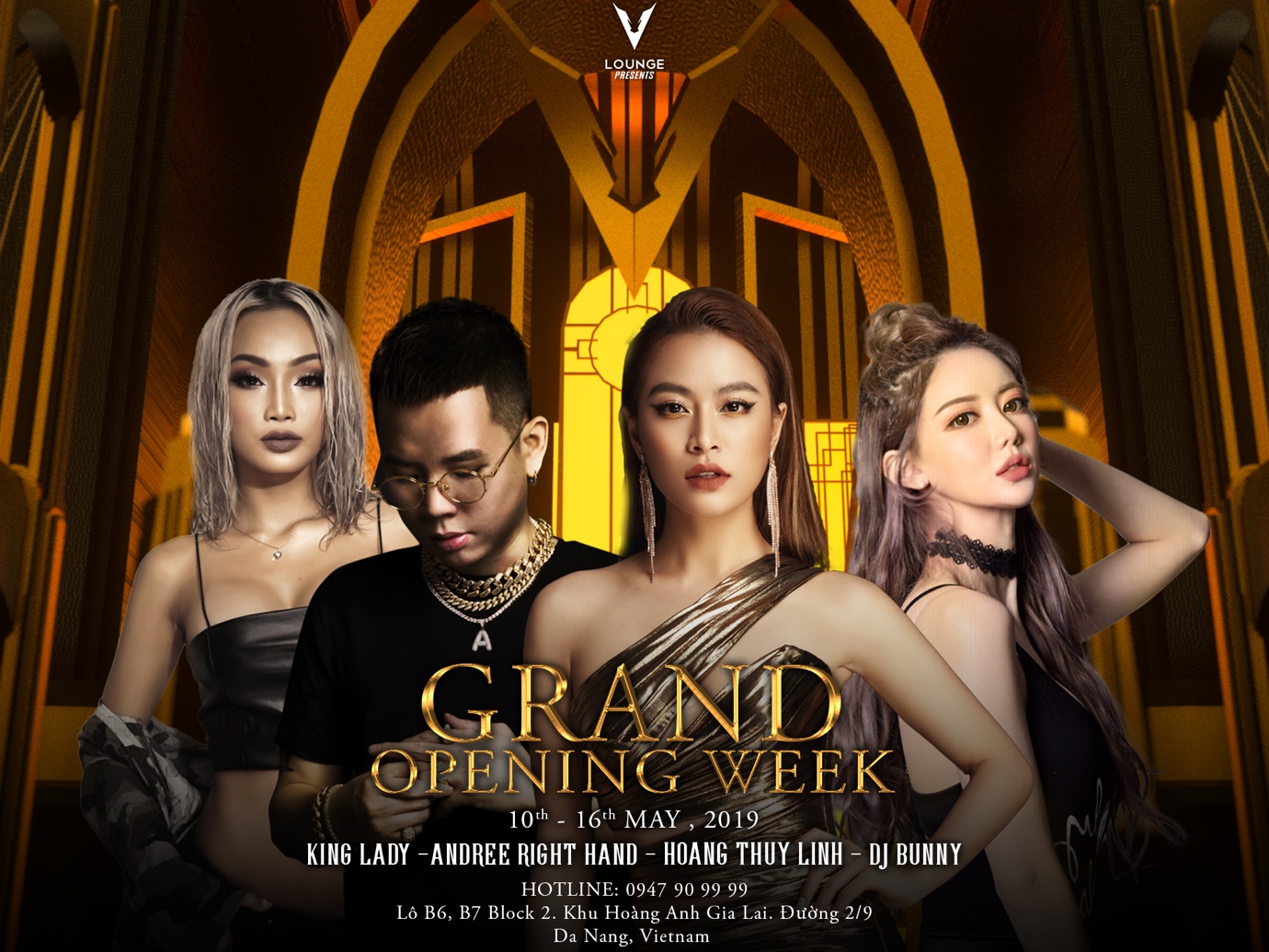 Sự kiện VLOUNGE GRAND OPENING WEEK với sự góp mặt của các gương mặt đình đám như Hoàng Thùy Linh, DJ King Lady, Andree Right Hand, DJ Bunny sẽ diễn ra từ 10/5 - 17/05, V.lounge hứa hẹn sẽ trở thành điểm đến cực kì hấp dẫn cho các tín đồ “nightlife” Đà Nẵng