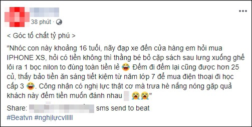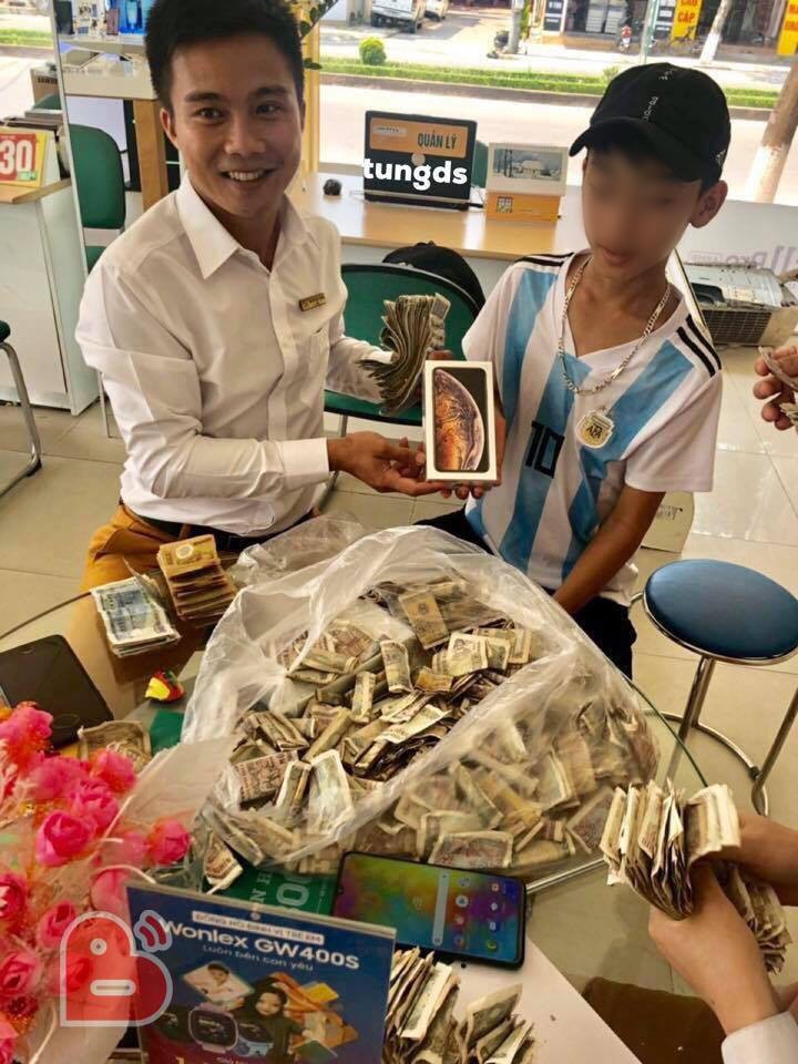 “Nhóc con này khoảng 16 tuổi, nãy đạp xe đến cửa hàng em hỏi mua iPhone XS, hỏi có tiền không thì thằng bé bỏ cặp sách sau lưng xuống ghế lôi ra 1 bọc nilon to đùng toàn tiền lẻ, đếm đi đếm lại cũng được hơn 25 củ. Thấy bảo tiền ăn sáng tiết kiệm từ năm lớp 7 để mua điện thoại đi học cấp 3.
