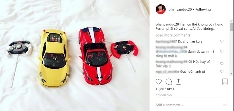 Mới đây, người hâm mộ vô cùng thích thú khi chàng tiền đạo Văn Đức đăng tải khoe hai “siêu xe” mới tậu lên trang cá nhân. Hai chiếc xe “siêu xe” Ferrari màu đỏ và vàng được đặt trên giường. Tính thời điểm này, có lẽ Văn Đức là người sở hữu nhiều siêu xe mini nhất đội tuyển. Người hâm mộ không quên để lại những bình luận hài hước: “Đua xe không anh?”; “Đúng đại gia rồi, Văn Đức nhà ta không có gì ngoài siêu xe”;…