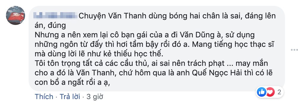 D.T thì khá “xắt xéo” : “Khoe đi du học, top khá thạc sĩ mà sao bạn gái anh sống lỗi quá vậy? Chắc từ bây giờ, đội nào đá với anh đều phải rón rén dè chừng quá, chứ không thì bị bạn gái anh tế sống liền mất”