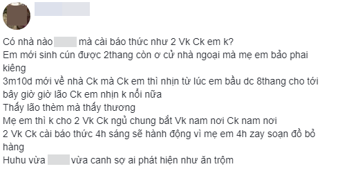 Mẹ em thì không cho hai vợ chồng ngủ chung, bắt vợ nằm một nơi chồng nằm một nơi. Hai vợ chồng cài báo thức 4h sáng sẽ hành động vì mẹ em 4h dậy soạn đồ làm hàng. Huhu vừa làm chuyện ấy vừa canh, sợ ai phát hiện như ăn trộm”.